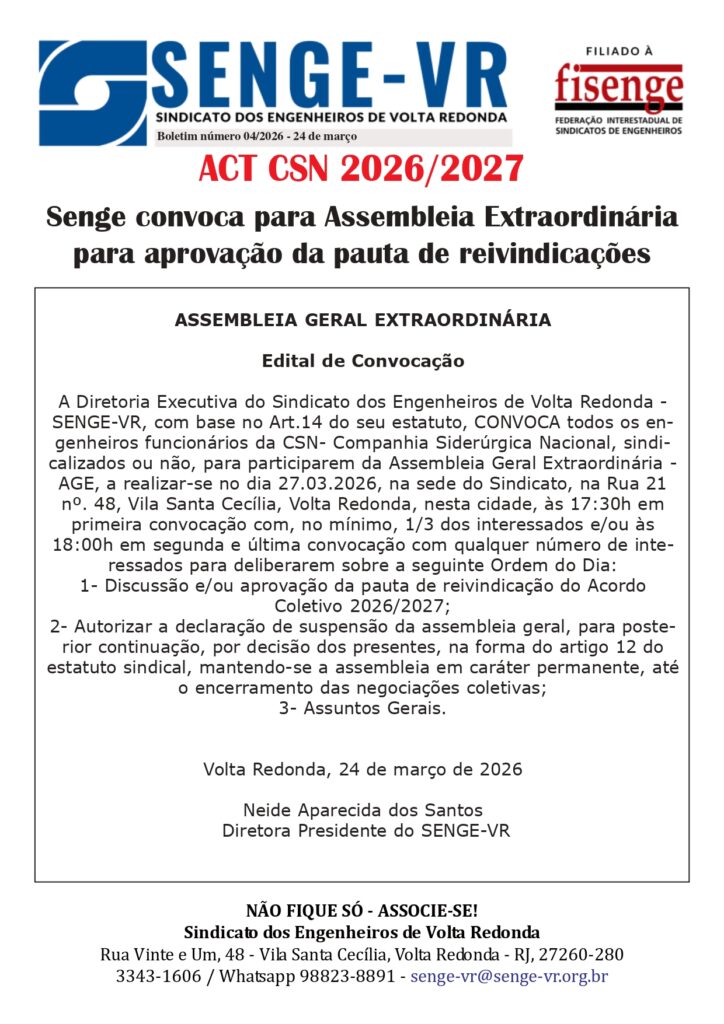 Boletim SENGE VR Informa n° 04/2026 – ACT 2026 da CSN: Assembleia para aprovação de pauta
